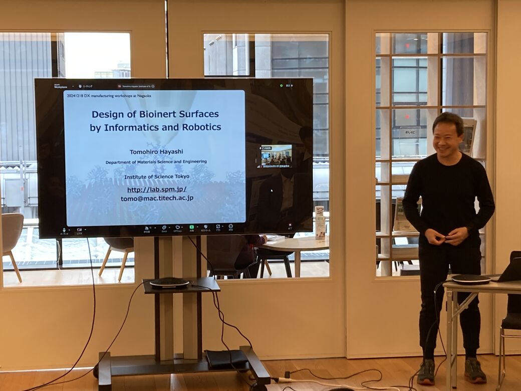 Researchers gave presentations on "Design of Bioinert Surfaces by Informatics and Robotics", "Design for Additive Manufacturing", and "Cold Spraying Technology for Additive Manufacturing". After the presentations, there was a poster session in which participating students presented their research to one another. This was followed by a group discussion on "DX for Industry" and "DX for 3D Bio-surface Design", in which the participants engaged in lively Q&A and debates.