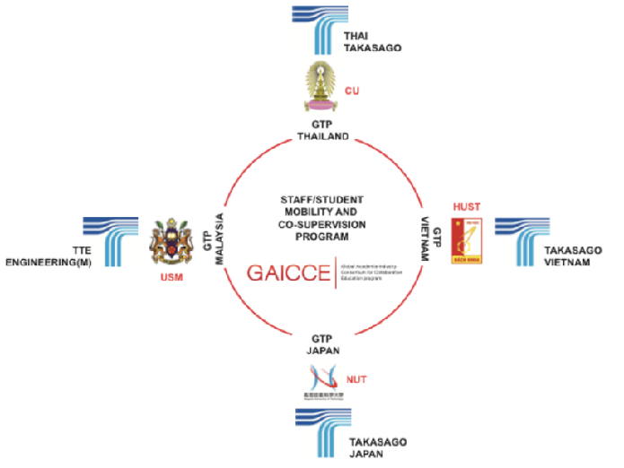 - Promoting Global Academia-Industry Consortium for Collaborative Education (GAICCE) utilizing GIGAKU Techno Park (GTP*) network with CU (facilitator), NUT, HUST, USM, and Takasago Thermal Engineering Co., Ltd