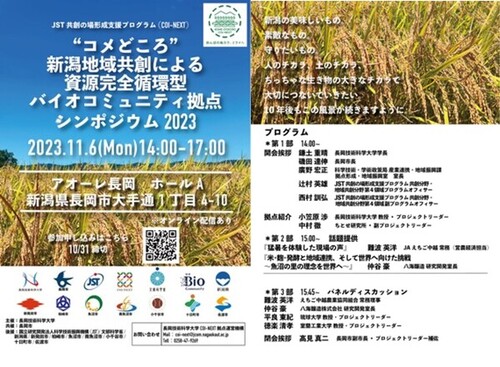 令和5年11月6日(月曜)にアオーレ長岡で『JST 共創の場形成支援プログラム(COI-NEXT)「"コメどころ"新潟地域共創による資源完全循環型バイオコミュニティ拠点」シンポジウム2023』を開催いたします。