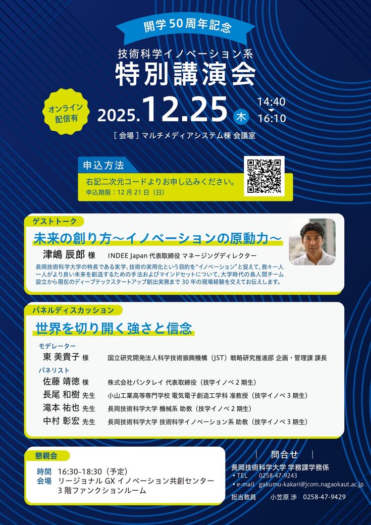 この度、開学50周年を記念して技術科学イノベーション系特別講演会を開催することとなりましたので次の通りご案内いたします。