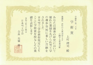 上村靖司教授が日本雪工学会学術賞を受賞しました。