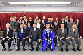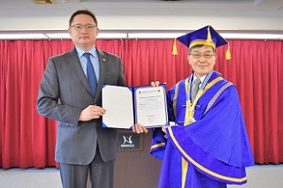 今回の授与は、本学のツイニング・プログラムでの学生受入やスーパーグローバル大学創生支援事業での現地オフィス開設等、モンゴル科学技術大学とのこれまでの国際交流に関する多大な貢献に対し授与されたものです。モンゴル科学技術大学の名誉博士となった東前学長には、モンゴル科学技術大学のカラーを表したガウンが贈られました。