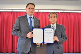 令和3年11月19日(金曜)、本学の第一会議室において、モンゴル科学技術大学の名誉博士の称号が東信彦前学長に、名誉教授の称号が三上喜貴元理事・副学長にそれぞれ授与されました。