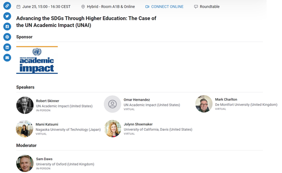 6月25日(土曜)、国連システム学術評議会(ACUNS)の年次総会内のパラレルセッションとして開催された「高等教育を通じたSDGsの推進:国連アカデミック・インパクト(UNAI)の事例」において、UNAI SDGsハブ大学から本学(UNAI SDG9ハブ大学)とデモンフォート大学(UNAI SDG16ハブ大学)の2校、UNAI加盟大学から1校(カリフォルニア大学デービス校)が招待を受け、パネリストとして参加いたしました。