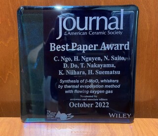 本賞は、Journal of American Ceramic Societyに前年採択された論文約600報中、査読者やエディター、読者から推薦され、最も大きなインパクトを与えた論文に与えられる賞で2022年10月10日から行われているTechnical Meeting and Exhibition, Materials Science and Technology 2022において受賞記念講演が行われ、代表してNgo Minh Chu氏に盾が授与されました。