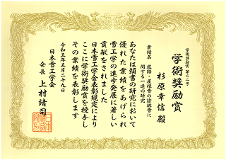 日本雪工学会学術奨励賞は、日本雪工学会の刊行物に論文を発表し、これが雪工学における学術、技術の進捗発展に寄与すると共に、優れた独創性と将来発展の期待できる萌芽的内容に富むと認められた場合に授与されます。授与式は、2023年5月29日に開催された日本雪工学会2022年度学会賞授与式(オンライン)において行われました。