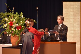 また、学生表彰も併せて行われ、学業の成績優秀者20名に、鎌土学長から表彰状及び記念品が贈られました。