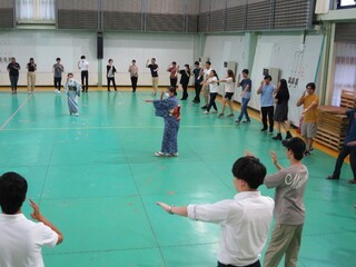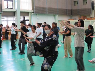 長岡まつりの民踊流しに参加するため、講師の指導のもと、日本人学生、外国人留学生、教職員が練習に励んでいます。異文化交流を深め、地域との絆を強めるこの活動は、参加者全員にとって貴重な経験となっています。