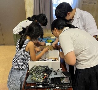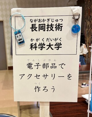 本学からは、国際産学連携機構及び地域共創室の教職員とSDGsプロモーターの学生が参加し、UVレジンを用いたアクセサリーづくりのワークショップを行いました。身近な電子機器から出る廃棄物(電子ごみ)といった環境やリサイクルに関わる要素を工作活動に取り入れることで、科学に対する関心を高めてもらうだけでなく、環境問題についての考え方を豊かにし、子どもたちと持続可能な社会について考える大変意義のある1日となりました。