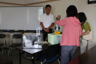 小学生・保護者向けでは、GX棟での研究や取組、クリーンエネルギー、ドローンや計測機器の活用について説明しました。参加者はドローンの機体、バッテリーの重さを体感した後、ドローンのカメラを使用した会場のリアルタイム撮影により3D計測技術について学びました。講義の後、縦渦で駆動する安全な風車の説明や、実際に安全な風車を触る体験・見学が行われました。