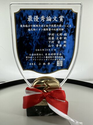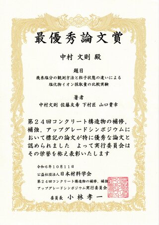 環境社会基盤系 中村文則准教授・佐藤友希(本学学生)・下村匠教授・山口貴幸技術職員が、日本材料学会(コンクリート構造物の補修・補強・アップグレード論文報告集)最優秀論文賞を受賞しました。受賞の対象となった論文は「飛来塩分の観測方法と粒子状態の違いによる塩化物イオン採取量の比較実験」です。最優秀論文賞は、コンクリート構造物の補修・補強・アップグレード論文報告集(査読付論文)に掲載された論文のうち、その内容が最も優れているものに対して、その著者全員に授与されるものです。