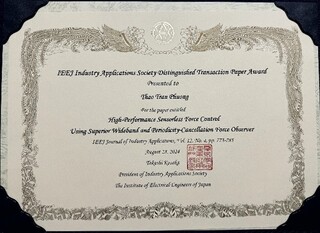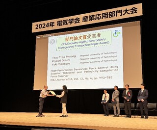 電気電子情報系 Tran Phuong Thao助教、大石潔名誉教授、横倉勇希准教授が、電気学会産業応用部門大会にて2024年産業応用部門論文賞を受賞しました。受賞の対象となった論文は「High-Performance Sensorless Force Control Using Superior Wideband and Periodicity-Cancellation Force Observer」です。産業応用部門論文賞は、電気学会英文論文誌D(IEEJ Journal of Industry Applications)に公開された論文の中で特に秀でたものに贈られます。授賞式は、2024年8月28日電気学会産業応用部門大会(水戸市市民会館)において行われました。