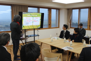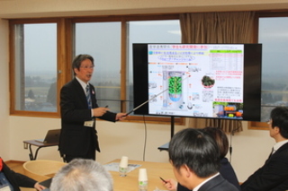 はじめに本学の鎌土学長から、本学の特徴およびものづくり地方都市の持続的発展に向けた取組について説明し、続いて技術科学イノベーション系 小笠原教授からJST共創の場形成支援プログラム(COI-NEXT)に採択された「“コメどころ”新潟地域共創による資源完全循環型バイオコミュニティ拠点」や全国の高専と連携する「発酵を科学するアイデアコンテスト」などの取組を紹介しました。また、本学の研究圃場で栽培し雪室で貯蔵したお米や、コンテストで評価の高かった発酵食品をご試食いただきました。