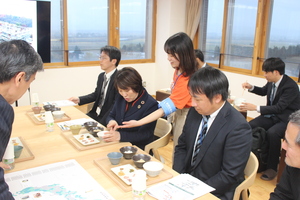 小笠原教授(写真左)から説明を受けるあべ大臣(写真奥右)、池田産業連携・地域振興課長(写真奥左)