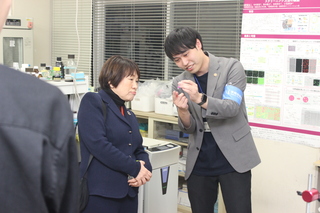 続いて、発酵科学研究室の視察では、微生物を探索する技術や探索した微生物を培養する技術などの研究成果を担当教員から説明を受けられ熱心に耳を傾けられました。