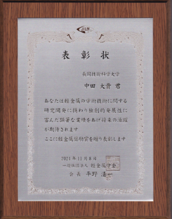 本賞は、軽金属の学術または工業に関する独創性、発展性に富む業績をあげ、将来軽金属学会における活躍が期待される新進気鋭の研究者、技術者に贈られるものです。