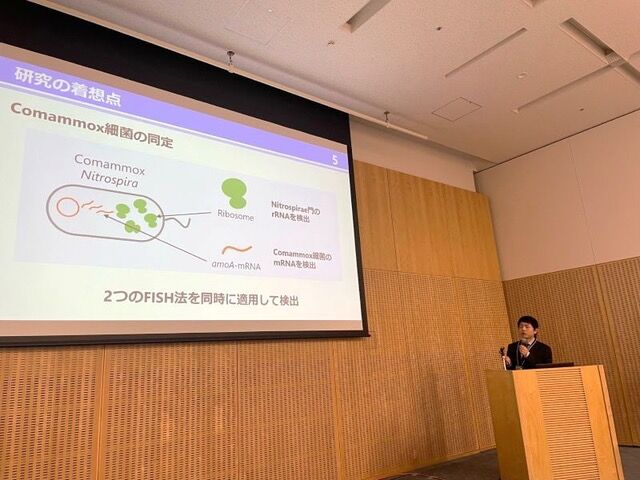 本研究は、窒素除去に関わる新規微生物として世界的に注目を浴びるComammox細菌をrRNAとamoA遺伝子を用いて精度良く検出できる技術を世界ではじめて構築しました。この研究を土木学会環境工学研究フォーラムの査読論文セッションに投稿し、採択後はフォーラムにて口頭発表も行いました。この発表が審査員の高い評価につながり、今回の受賞となりました。