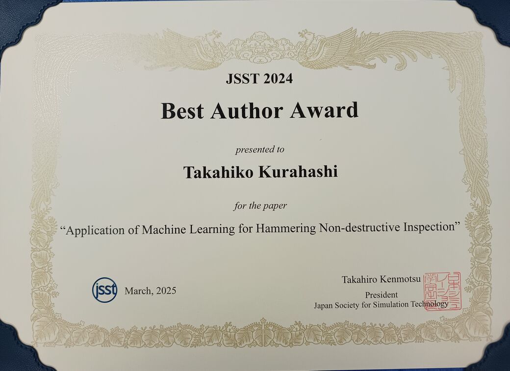 機械系 倉橋貴彦教授が、日本シミュレーション学会ベストオーサー賞を受賞しました。受賞の対象となった論文は「打撃非破壊検査に対する機械学習の適用」です。ベストオーサー賞は、『シミュレーション』に掲載された記事・論文で特に優れた著作に贈られます。