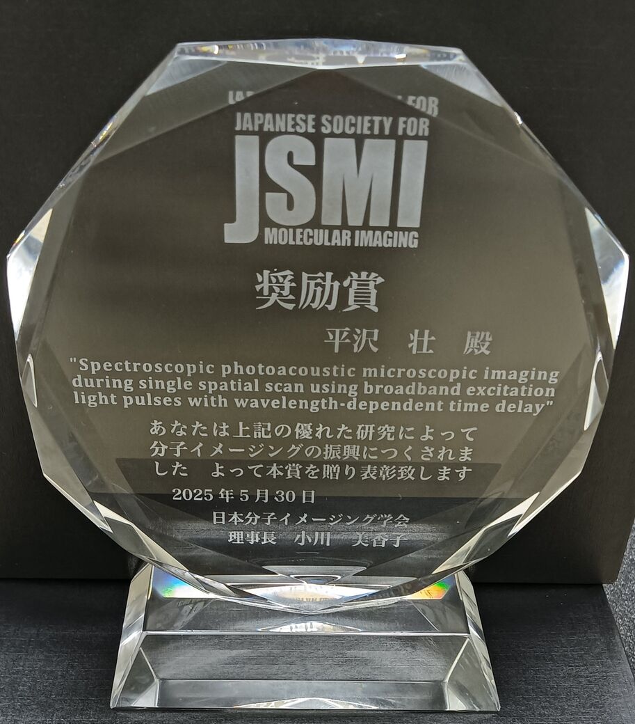 受賞の対象となった論文は、Elsevier社が発行する英文論文誌Photoacousticsに掲載された「Spectroscopic photoacoustic microscopic imaging during single spatial scan using broadband excitation light pulses with wavelength-dependent time delay」です。