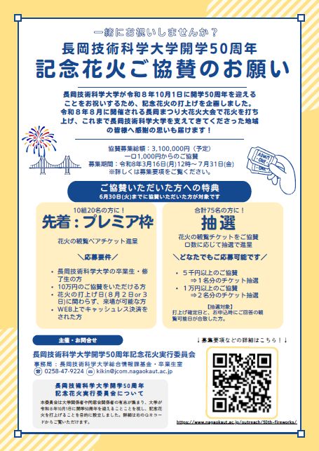 長岡技術科学大学が令和8年10月に開学50周年を迎えることを祝し、有志により「長岡まつり大花火大会」にて記念花火を打ち上げます。