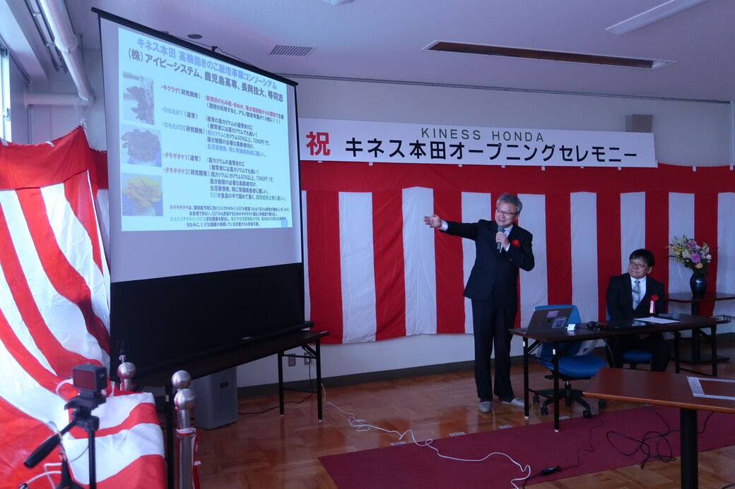 本学は、同施設を拠点とし、株式会社アイビーシステム様および鹿児島工業高等専門学校と連携した「高性能キノコ栽培事業コンソーシアム」を構築し、高性能キノコの実証栽培を行う予定です。当日のオープニングセレモニーでは、出席者約80名を前に、山口教授より本事業の概要説明が行われました。