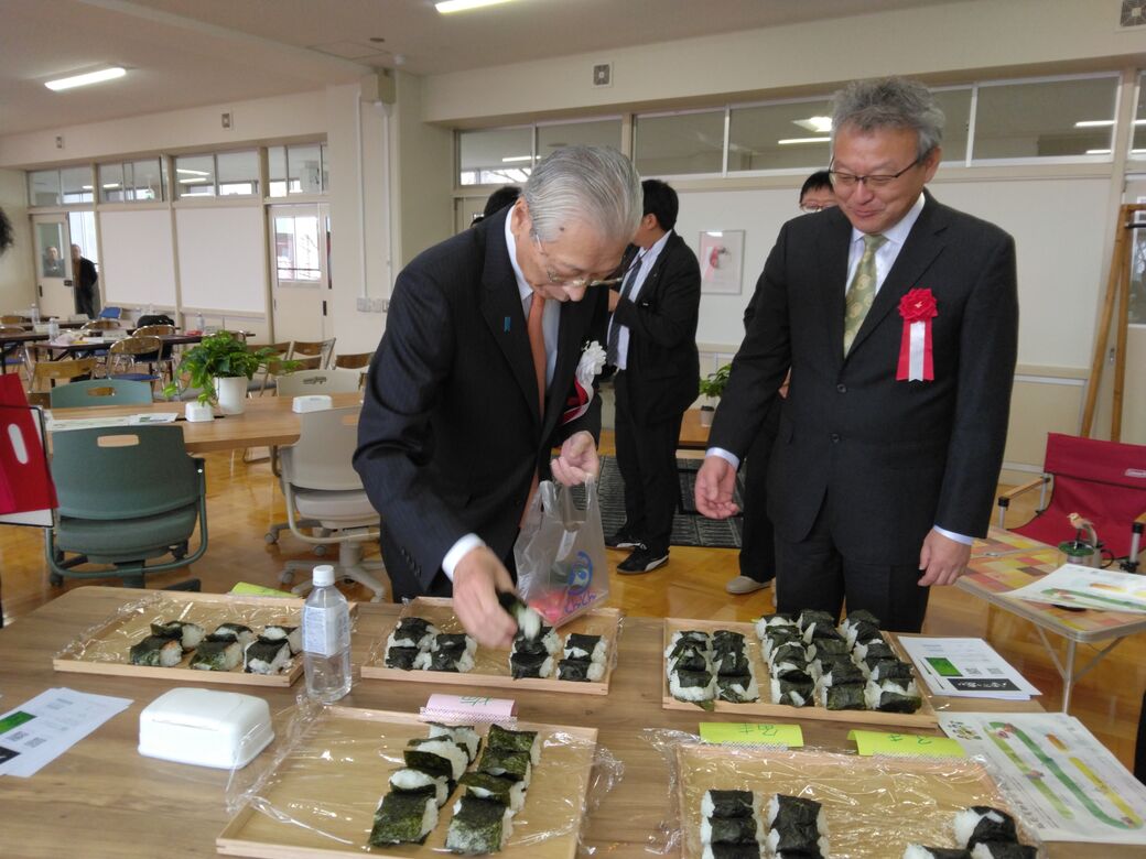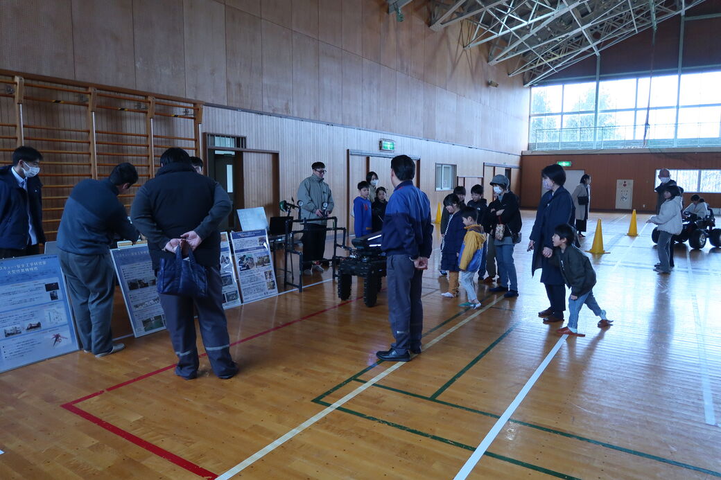 式典に続き開催されたサイドイベントでは、本学学生による「災害時用ロボット実演」や「電動キックボード体験」のほか、本学のCOI-NEXT事業における研究圃場で栽培し雪室貯蔵したお米を用いて「おむすび作り・試食体験」が行われました。集まった小中学生や保護者、地域の皆さまに最先端技術や研究成果に触れていただく機会となり、50名を超える参加者を得て会場は大盛況となりました。