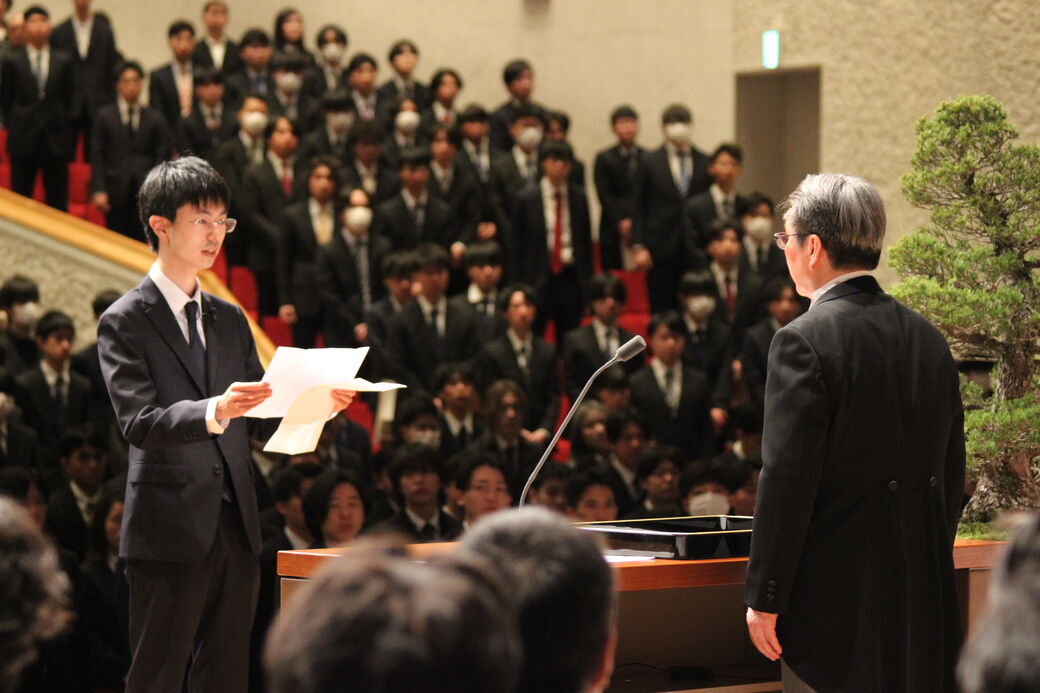 引き続き、入学生を代表して、学部第3学年物質生物工学分野の鹿野謙人さんが宣誓を行いました。