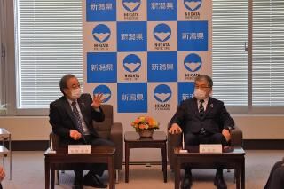 新潟県庁において行われた締結式では、東信彦学長と花角英世新潟県知事が協定書を交わしました。挨拶で東学長は「本学の培ってきた防災・減災に関する実践的な技術開発を活かし、新潟県と連携しながら地域貢献と産業の活性化を図っていきたい」と述べ、花角知事は、「県内の企業の技術と大学が持っている力を組み合わせて、防災に関する新しいサービスや商品を生み出していきたい」と述べました。