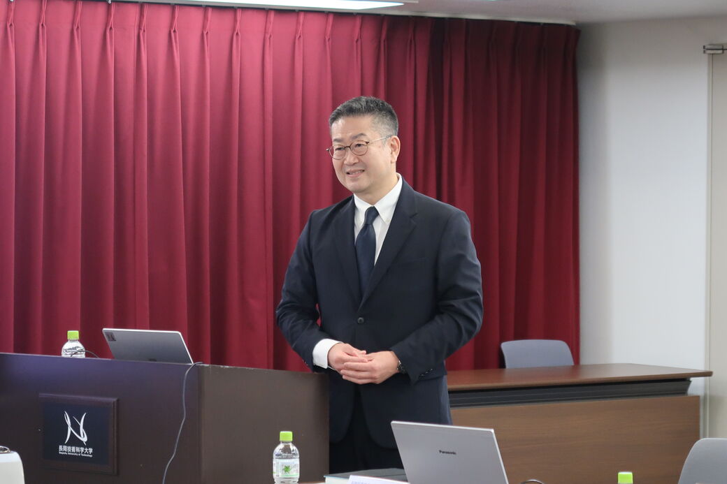 はじめに本センターの活動について説明し、本年3月の外部評価委員会において「研究開発」「社会実装・商品化」「社会連携」などで高い総合評価をいただいたことを報告するとともに、「ぼうさいこくたい2025」や「大阪・関西万博」などの大型イベントで研究成果を発信したこと、さらにBSN新潟放送との協定によりテレビや新聞での掲載が増え、社会的な発信力が一層高まったことを紹介しました。