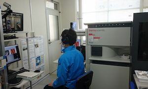 学生2名が本学へ訪れ、本学の古野URAと齊藤(信)准教授のサポートのもと試料導入から測定まで自ら行い、青柳教授はzoomにて参加し対話をしながら分析を進めました。