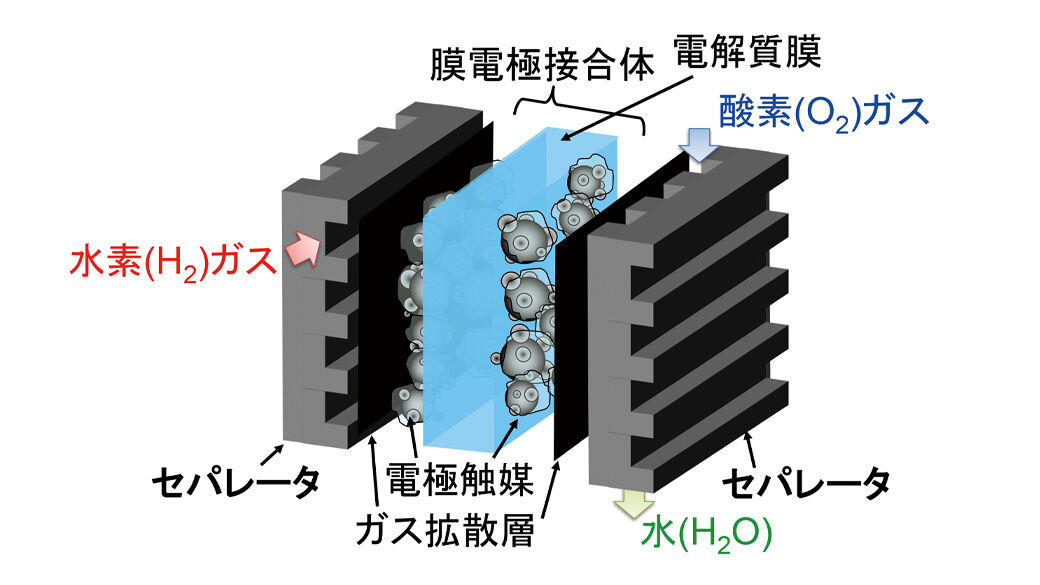 この水素と空気(正確には空気中の酸素)から発電することができるのが燃料電池です。皆さんも水を電気分解すると水素と酸素が出てくるというのは理科の実験で見たことがあると思います。この逆反応を利用して発電することができるのが燃料電池になります。ただ、水と酸素を直接、混合すると爆発的反応が進行してしまうため、電解質膜と電極触媒を一体化した膜電極接合体と呼ばれるものを用いて、水素と酸素を別々に供給し、膜電極接合体の両側で反応させ、水を生成することで発電します(図1)。そのために必要になってくる部材の一つが集電機能を持つセパレータです。